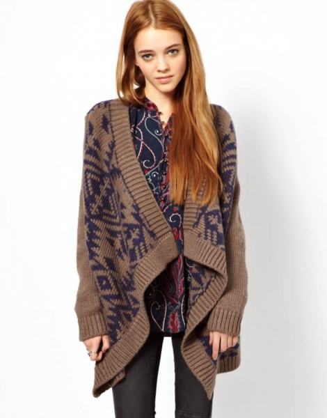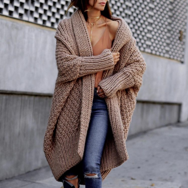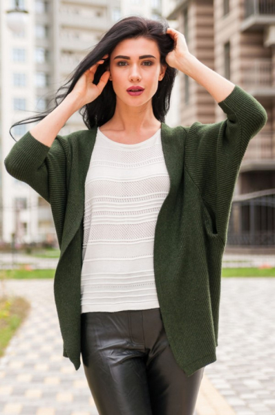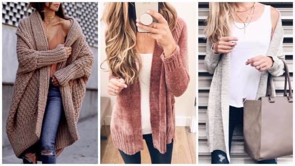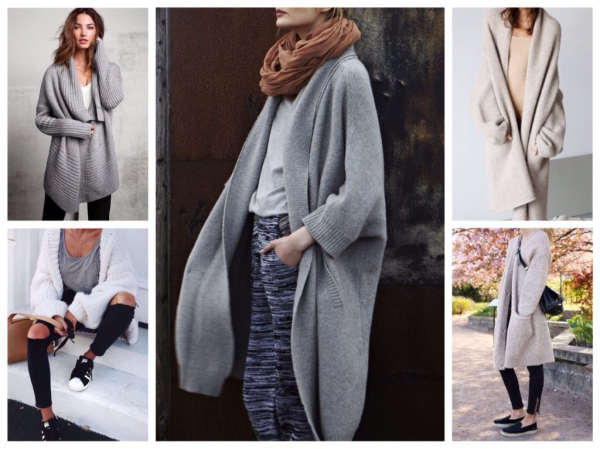 Оригинальности образу придадут кардиганы модели летучая мышь. Универсальный вариант для женщин любой фигуры. Они могут быть пошиты из разных тканей или же связаны из теплой пряжи.