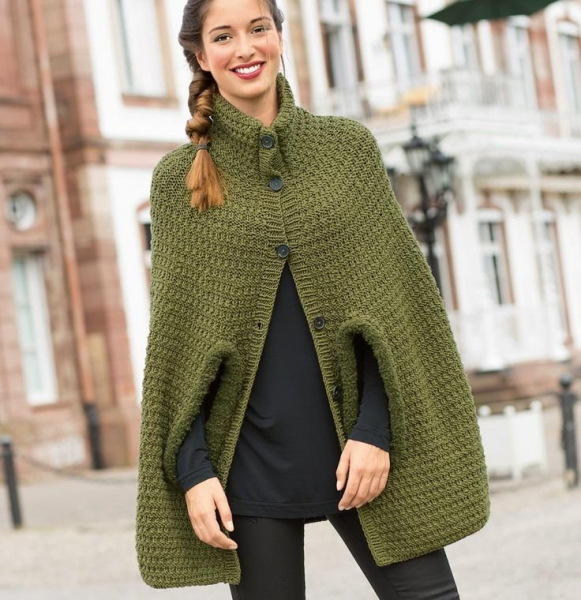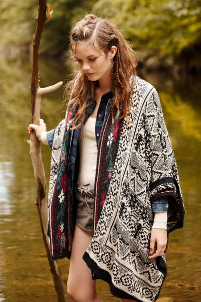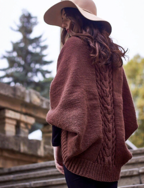 Кардиган-пончо — пример непривычной, но весьма оригинальной модели. У нее нет горловины, а для удобства сделаны скрытые застежки. Отличный выбор для тех, кто любит стиль гранж, бохо.