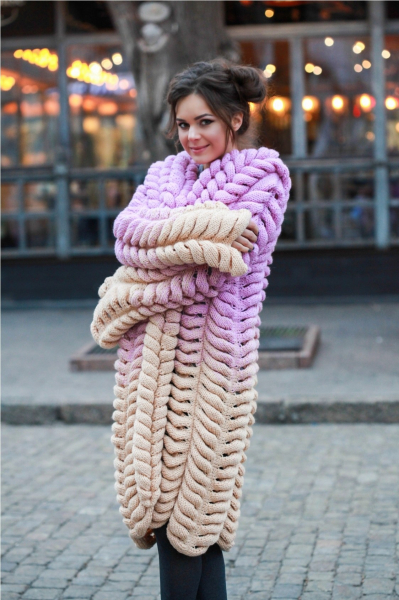 Еще одна интересная тенденция — градиент. Ее с успехом реализуют в кардиганах лало. Плавные переходы от одного цвета к другому выгодно подчеркивают крупные косы.
