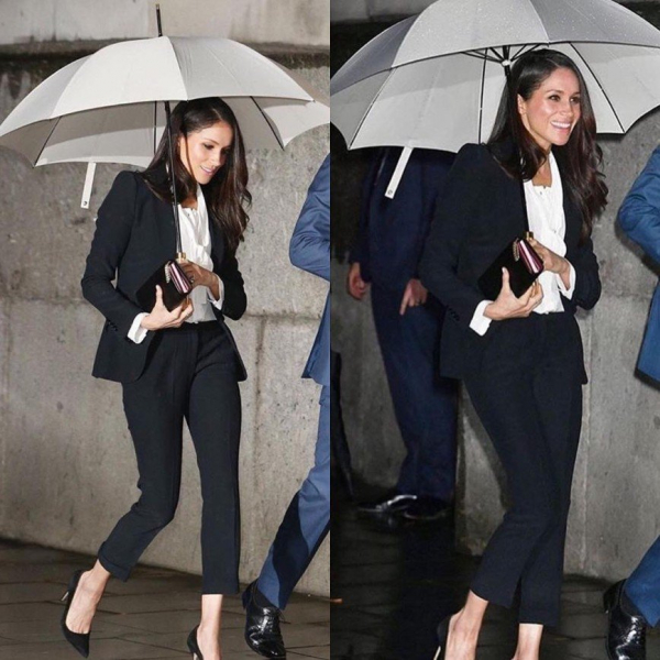 Жакет и брюки отличаются приталенным изящным силуэтом. Для подобного сочетания необходима элегантная узкая обувь.