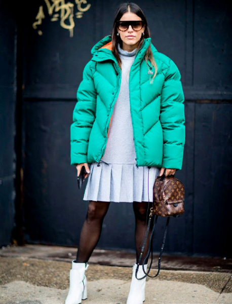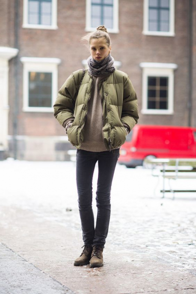 Интересно смотрятся модели пуховиков с укороченными рукавами и тонким поясом, идущим ровно по линии талии. Так образ будет выглядит элегантным и женственным.