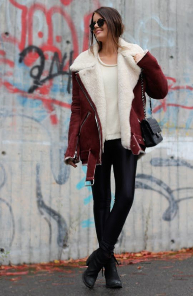 Для осени подойдут укороченные модели таких курток. Сочетать с шарфом — не лучший вариант. Оптимально подобрать водолазку или свитер с высоким горлом. Манжеты и воротник могут быть украшены мехом, а сама куртка — с капюшоном или без такового.