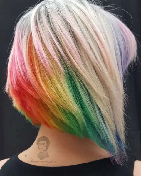 Как и в прошлом сезоне модное радужное окрашивание волос в 2019 году остается в тренде. Фото ярких прядей и радужных переливов продолжают украшать модные журналы, а на коротких волосах подобные смелые решения будут смотреться особенно стильно и эффектно. Если комбинация подобрана правильно, прическа подойдет даже для офисного стиля.