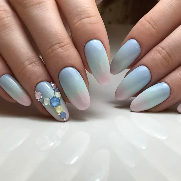 Новинкой сезона стала дизайнерская идея выполнения градиентного маникюра в светлых пастельных тонах. С дополнительным декором со стразами и биндасами, получается совершенно восхитительный эффект маникюра 21 века.