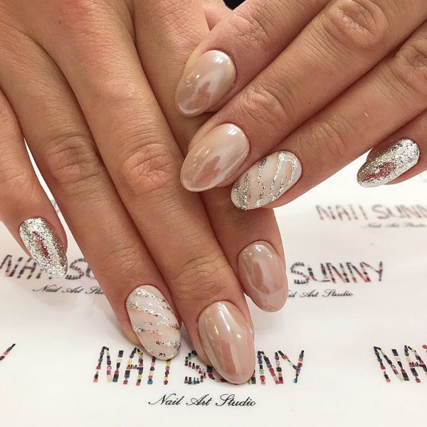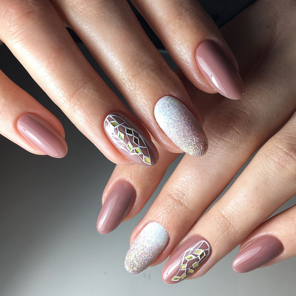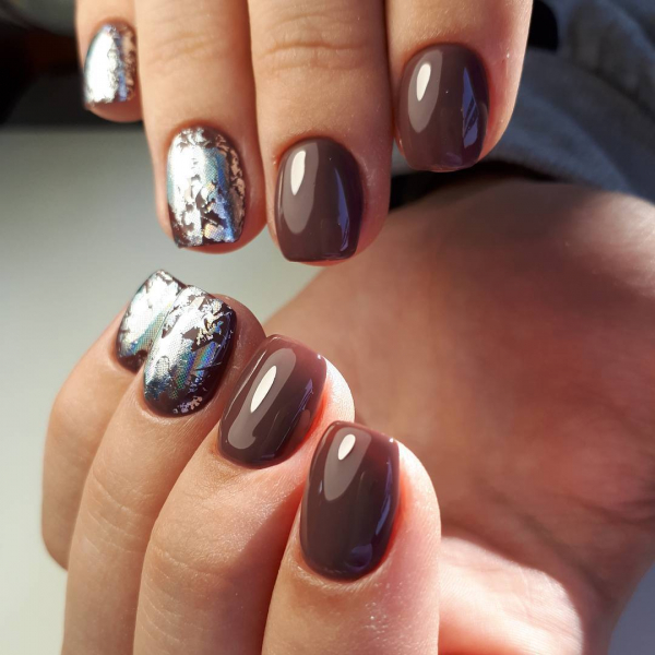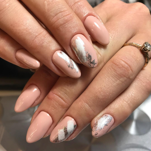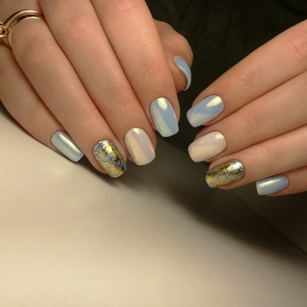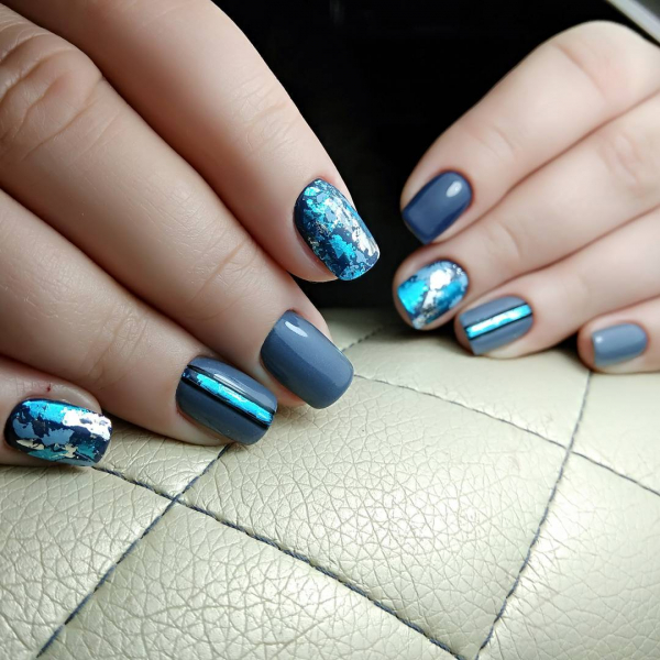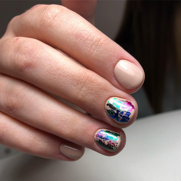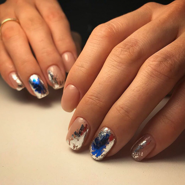 С помощь полосок фольги разных цветов и отражающего эффекта можно преобразить абсолютно любой известный маникюр сезона 2019. Даже простое покрытие ногтей нюдовыми оттенками гель-лака выглядит потрясающе эффектно и нарядно с кусочками фольги различной геометрической формы.