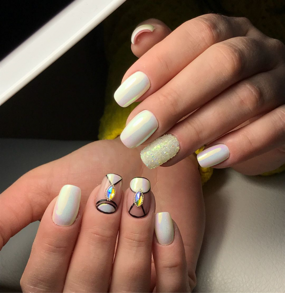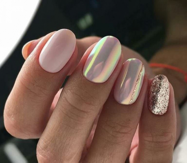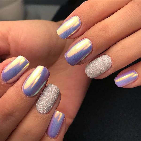 - радужная. Также позволяет создать сказочно красивый маникюр без особых хлопот. Представляет собой сочетание эффектов от жемчужной, голографической и втирки с эффектом северного сияния;
