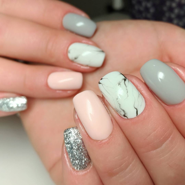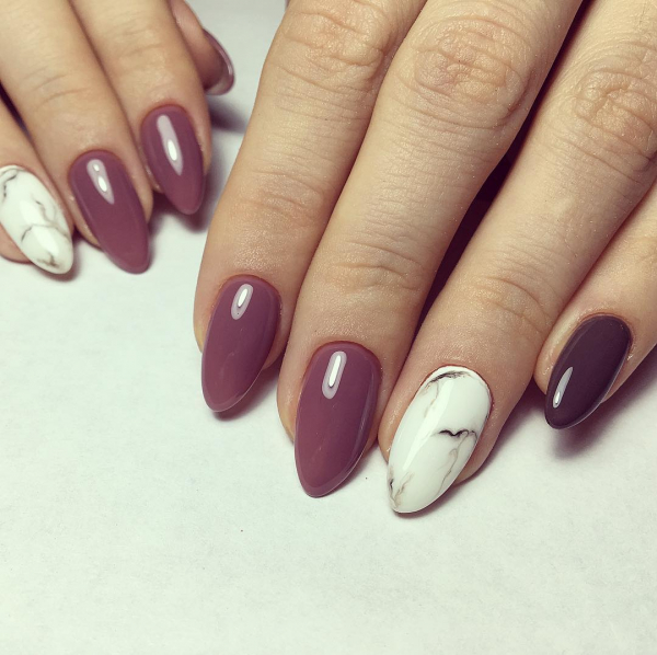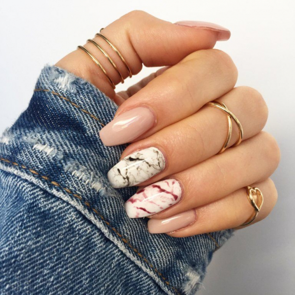 Модные тенденции 2019 года мраморного маникюра диктуют выбор цветовой палитры гель-лака, близкой к природному камню: