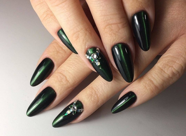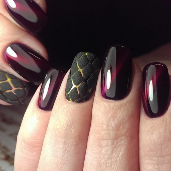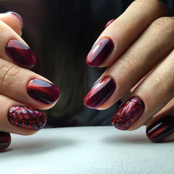 Набор специальных гель-лаков с металлическими частицами и несколько магнитов позволят создавать разнообразные трехмерные узоры с углублением цвета. В таком стильном маникюре 2019 создается ощущение бездонности картинки на ногтевой пластине.