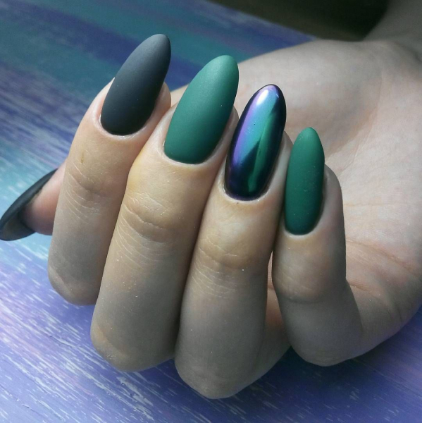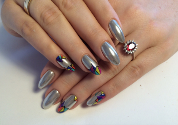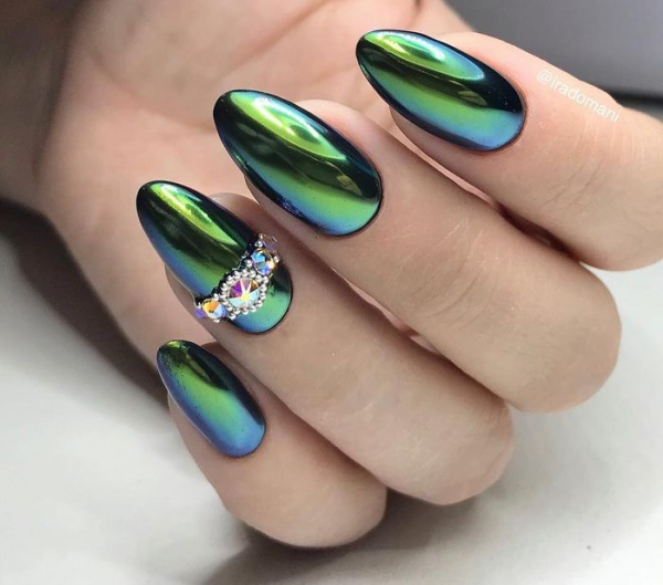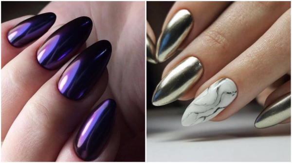 - зеркальная. Название говорит само за себя, создается впечатление, что цвет не нанесен на ногти, а отражается в них, как в зеркале;