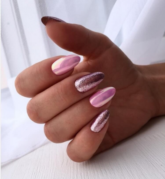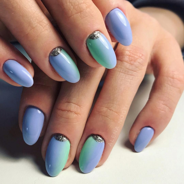 Так, согласно модным тенденциям 2019 года, градиентный маникюр теперь можно выполнять с глиттером, где меняется не только плотность блестящих частичек, но и их цвет.