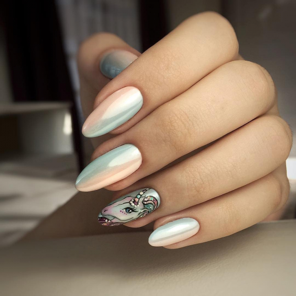 - северное сияние. Создается потрясающий по своему свечению современный маникюр 2019 в холодных тонах синего, голубого и фиолетового;