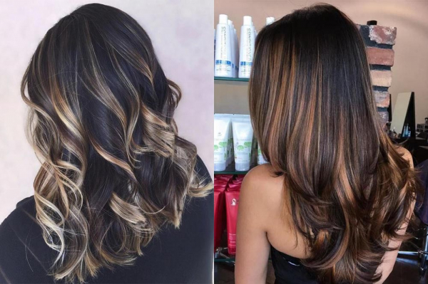 Для темных волос допускаются любые эксперименты. Окрашивание на средние волосы позволяет создавать плавные и контрастные переходы, сделать блики и акценты. Модная цветовая палитра для темных локонов включает медовые, кофейные и карамельные оттенки. Самыми актуальными будут пепельные тона, которые можно сочетать практически с любым основным цветом.