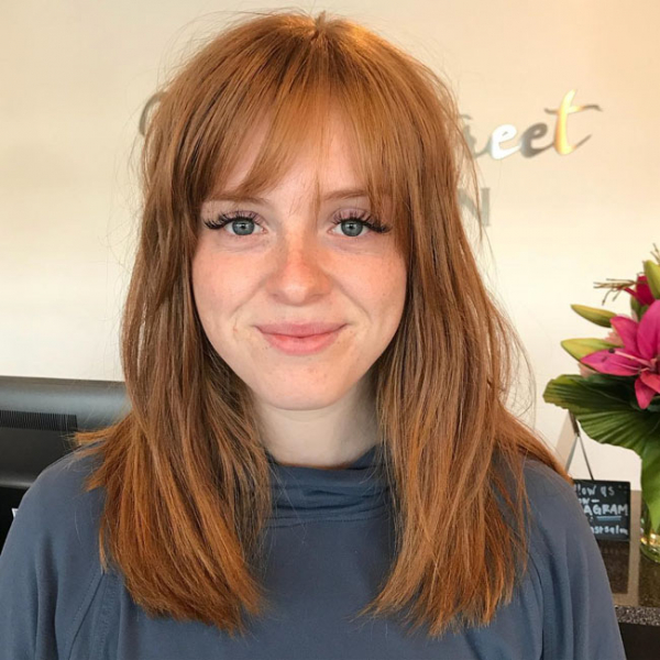 Достаточно лишь подобрать под себя подходящую густоту волос, длину и силу филировку. В результате локоны будут мягко спадать на лоб, добавляя девушке легкости и воздушности.