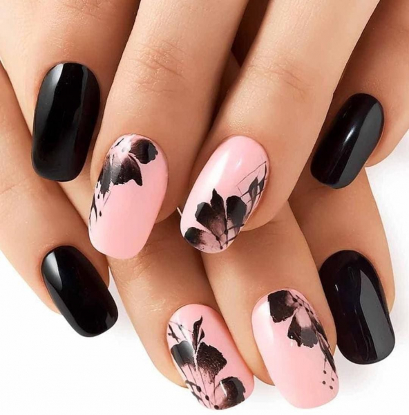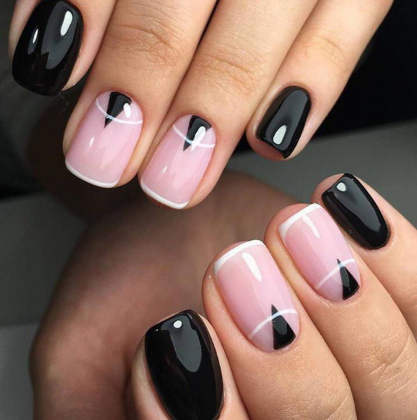 Чтобы маникюр приобрел изюминку, в работу следует добавить черный лак с розовым. На фото представлены интересные идеи.