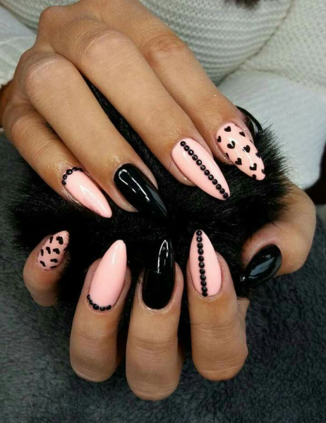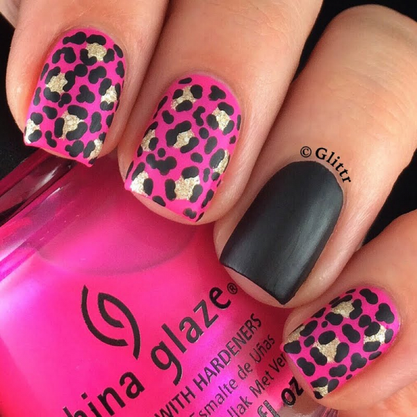 - Леопардовый принт. Самый простой дизайн, который можно выполнить в домашних условиях. Для работы необходимо подготовить 2 розовых лака, 1 черный, кисть. Достаточно окрасить ногти ярким лаком, поставить темные точки и обвести их бледным оттенком. Такой дизайн подойдет для летнего периода. Он прекрасно комбинирует с любыми нарядами.