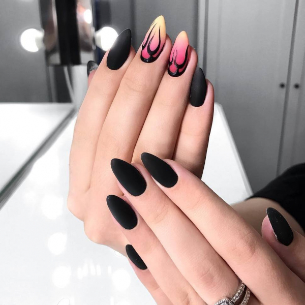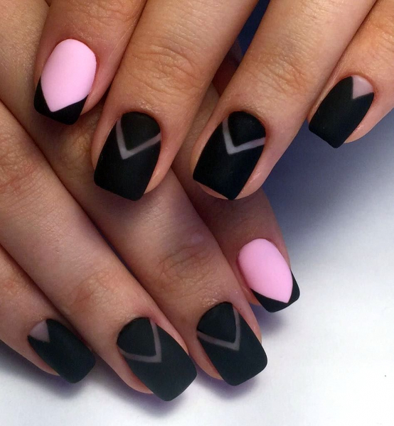 Матовый маникюр с черным и розовым оттенком смотрится бесподобно. Яркий цвет сделает дизайн нежным и романтичным, а темный бархат принесет в образ строгость. Это отличный вариант для прогулки или вечеринки. Каждая модница сможет показать свою индивидуальность.