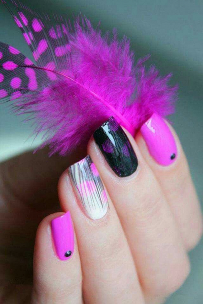 Черный и розовый лак – интересная комбинация. С их помощью можно создавать работы невероятной красоты. Яркий цвет придаст дизайну изюминку, темный тон отвечает за сдержанность. Если хочется быть в центре внимания, стоит выбрать именно черно-розовую цветовую гамму.