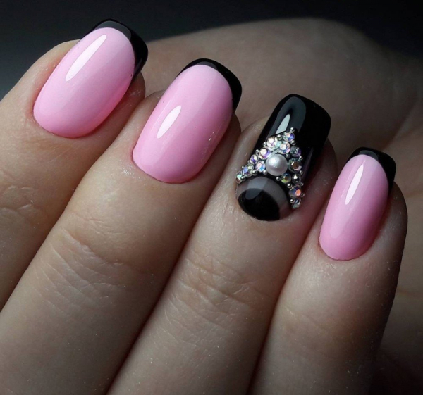 Маникюр черный с розовым смотрится интересно и оригинально. При чем не важно, какой цвет будет преобладать. В любом случае дизайн придаст ногтям изюминку, а своей обладательнице уверенность в собственной привлекательности. Если хочется сделать маникюр более праздничным, в работу стоит добавить стразы.