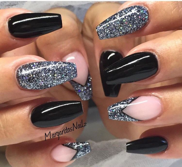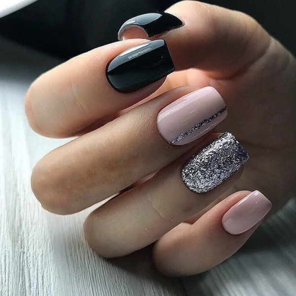 Сочетание черного с розовым и серебристым лаком бесподобно. Выполнить работу можно в домашних условиях, для этого необходимо подготовить глиттер. Его можно наносить как на край ногтя, так и использовать в качестве основного цвета. Не менее интересно смотрится градиент. В этом случае подчеркнуть переход оттенков можно с помощью блесток.