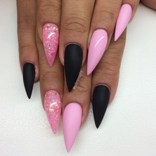 Привлекательный маникюр можно получить с помощью блесток. Почему бы для работы не использовать черный лак с розовым. Если в косметичке девушки появится несколько видов декоративных элементов, удастся получить интересные дизайны.
