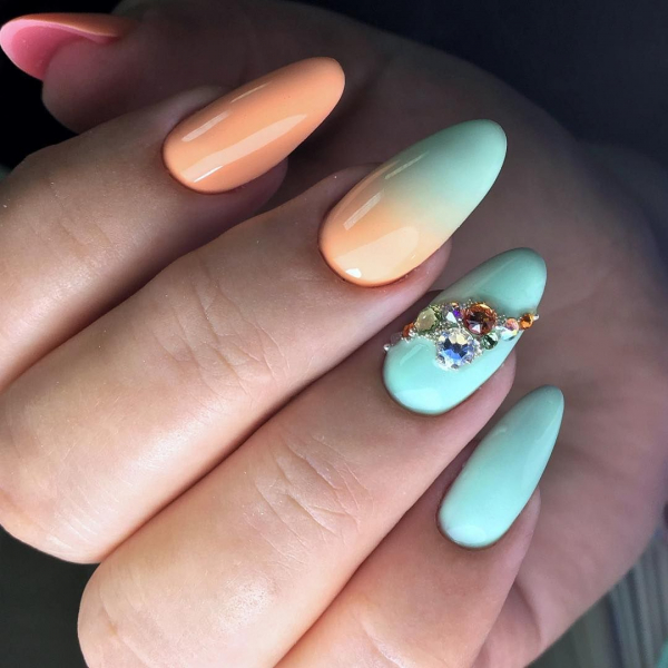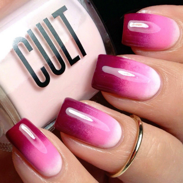Переход оттенков делается слева на право, а не сверху вниз. Можно использовать 2 тона, которые плавно сменяют друг друга или несколько цветов лака.