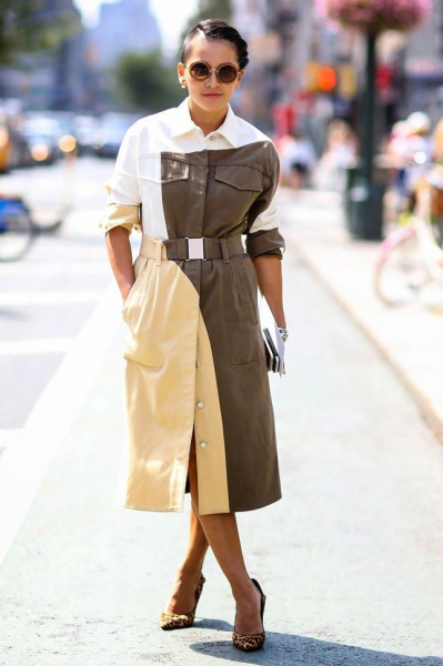 Лук, дополненный сумкой в стиле тоут, лодочками или босоножками на высоком каблуке – идеальное решение для офисного лука. В повседневных образах подобные модели сочетают с брюками, в основном – джинсами. Кстати, платья-рубашки из денима также считаются великолепным вариантом.