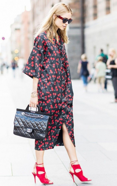 Весьма неординарно такие летние платья будут смотреться с босоножками на танкетке или каблуках.