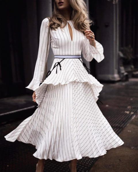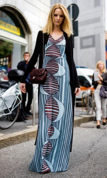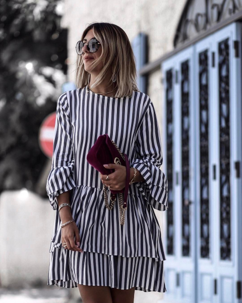 Помимо всего прочего, выделяют полосатые принты, однако стоит помнить, что горизонтальные полосы могут визуально сделать шире женский силуэт. Дизайнеры предлагают решения в черно-белом варианте, а также насыщенные комбинации с синим, алым, белоснежным, а также варианты с широкой и узкой полосой одновременно.