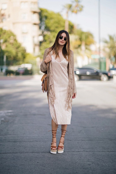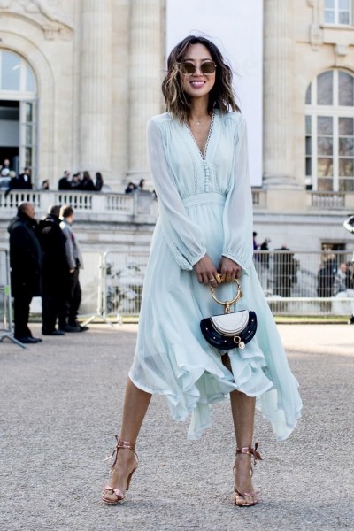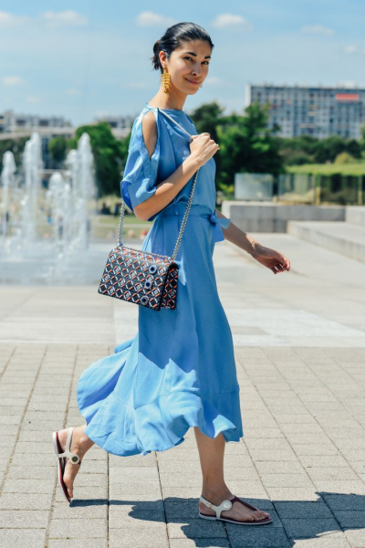 Летние платья, дополненные элегантными босоножками в классическом стиле и сумкой-клатч, из пайеток великолепно впишутся в вечерний образ.