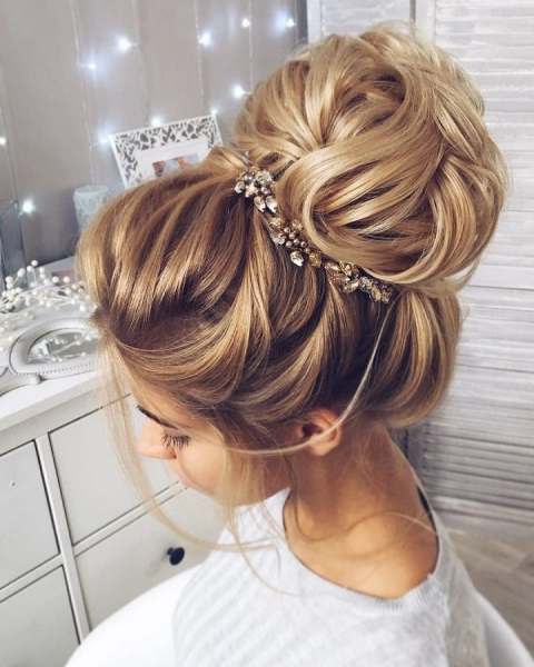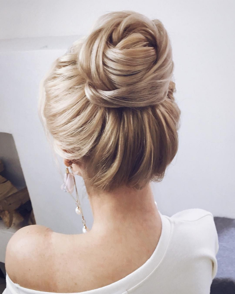 Такая высокая прическа визуально выглядит легкой и естественной. Пряди не стягиваются в пучке, а лежат свободно, создавая эффект воздушности. Из пучка на макушке создается объемный узел, который не нужно затягивать. Объем укладки на макушке создается с помощью легкого начеса, после чего пряди укладываются нужным образом и крепятся декоративными заколками.