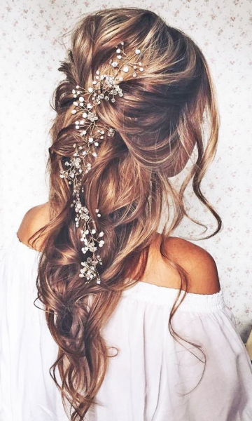 На распущенные длинные волосы можно прикрепить декоративные заколки, ленты, стразы и иной декор, который подходит к создаваемому модному луку.