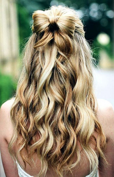 Из хвоста можно сделать бант. Его можно завить в тугие крупные локоны украсить декоративной лентой, заколками или текстильными цветами. Каждая девушка на основе такой прически сможет создать оригинальную укладку на выпускной самостоятельно с помощью мамы или подруг.