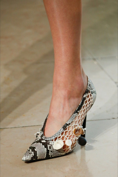 Дизайнеры в 2019 году также не поскупились и на оригинальную обувь. Помимо классики: туфель и босоножек с ремнем, в моду ворвалась обувь на каблуке-рюмке и остроносые балетки.