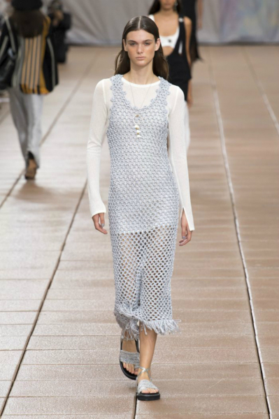 Дополняют популярные оттенки и металлические колеры – золото и серебро. В коллекциях знаменитых дизайнеров можно заметить стильные полупрозрачные подобия кольчуг, будто оставшихся со времен средневековых рыцарей. Футуристический модный металлик распространен не только в трендах женской одежды лета 2019 года, но и обуви.