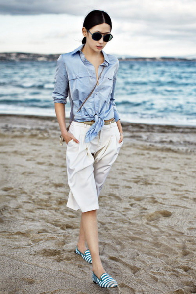 Отличным вариантом для походов на деловые встречи и в офис станут укороченные прямые модели брюк. Лучше всего их дополнять туфлями или босоножками на высоком каблуке. Самая выигрышная длина – которая прикрывает колено. Для летнего сезона отлично подойдут клешевидные брюки с разрезами по бокам.