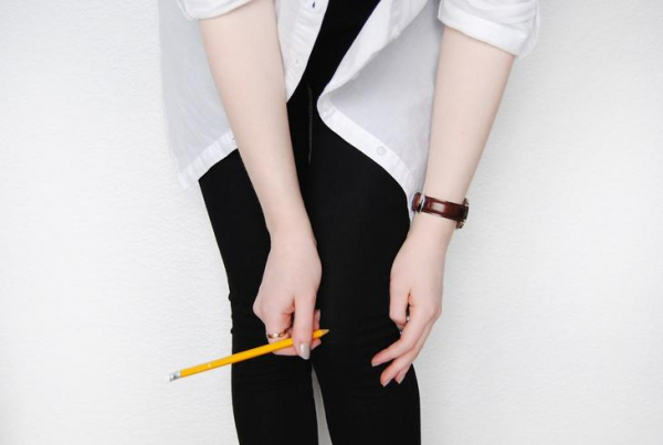 - Для начала, необходимо одеть черные джинсы на себя. Мелом начертить ровную линию середине коленок.