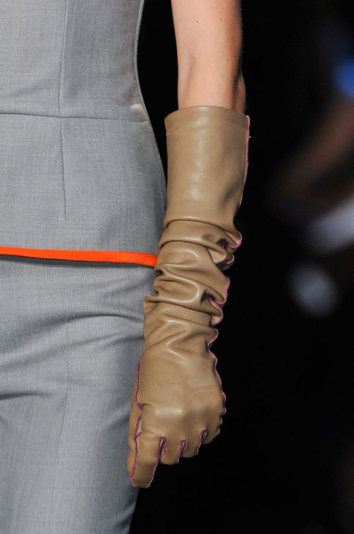 Особенно среди модных перчаток выделяются изделия от Луи Витон. Они изготовлены из матовой кожи черного цвета, а запястья украшают большие браслеты. Такие же аксессуары, только с акцентом на яркий цвет, замечены на перчатках оригинального кроя от Marc Jacobs.