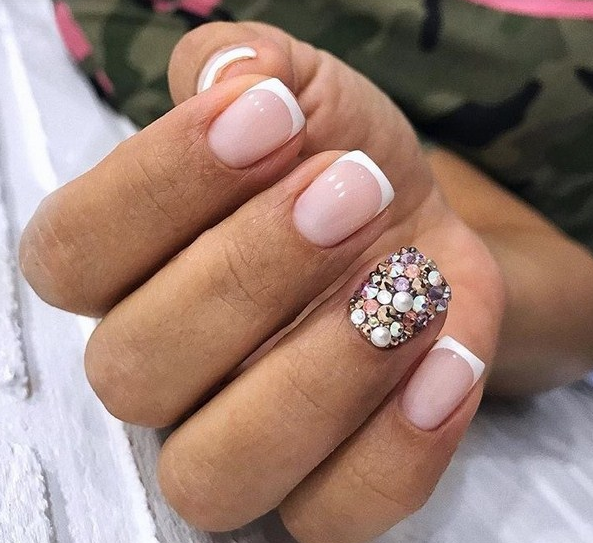 Отлично будет смотреться френч в пастельных тонах и на двух пальчиках веточки со стразами. Для летнего варианта можно выбрать листья цветов с каплями утреней росы.