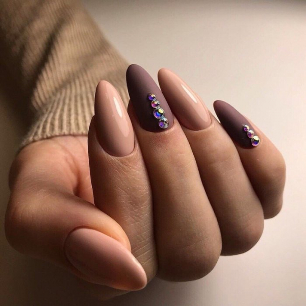 Оформляя классический матовый маникюр можно использовать технику омбре, френч, роспись, эффект битого стекла. А камни и бульонки придадут ногтям уникальности и эффектности.