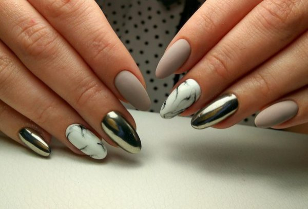 Чтобы придать готовому маникюру разнообразия, можно использовать фольгу, золотых нити, глиттер, стразы, сетку. Мраморный маникюр будет наиболее уместен для романтической встречи, торжественного и повседневного образа.
