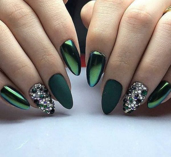 Серый маникюр с блестками на одном или двух пальчиках, достоен особого внимания. На коротких ногтях изумительно смотрится благородный изумрудный оттенок, дополнить его можно используя немного блесток и страз. Но такой вариант подойдет не всем женщинам. Чтобы маникюр на короткие ногти не смотрелся «обрубленным», не нужно акцентировать внимание на длине.