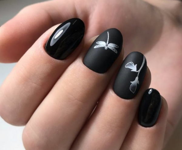 Модные идеи сезона включают матовые черные ногти с рисунками, однотонным дизайном, фольгой, кристаллами пикси, графическими принтами и линиями. Такой дизайн придает ногтям особый лаконичный вид.