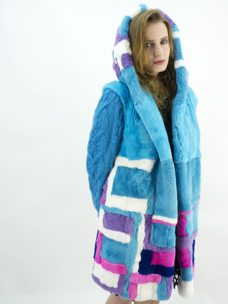 • Очень востребованным стало применение индивидуальной сборки – подготовленные шкурки режутся на полоски, а затем произвольно сшиваются. Итогом становятся изделия  с неповторимым дизайном. Приемлим клеш от линии груди, в особенно он актуален для обладательниц пышных форм. В 2019-2020 году в моде геометрически правильные виды кроя с узкой плечевой частью.