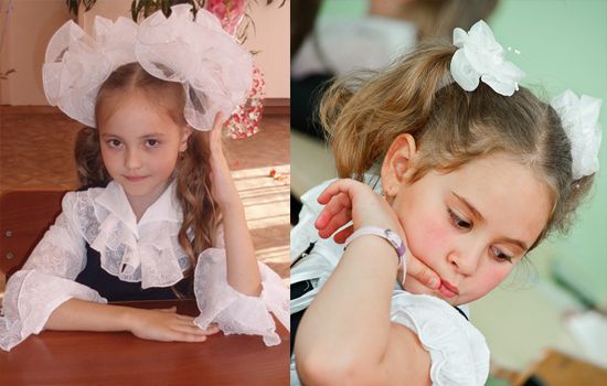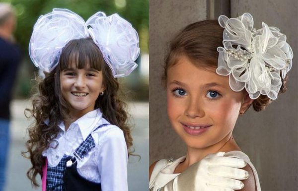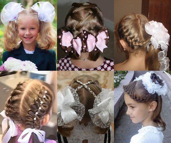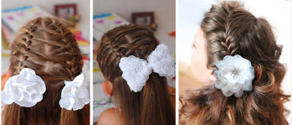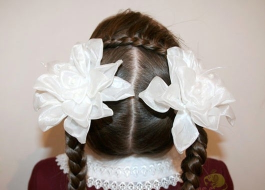 Кроме того, белые бантики создают максимально праздничный вид для девочки, так что на торжественную линейку укладка волос или плетение с использованием бантов, которые сделаны своими руками, подойдут как нельзя кстати.