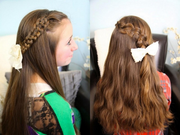 Теперь приступаем ко второй части волос, с которыми проделываем такие же манипуляции. Как только косичка готова, то мы перебрасываем ее с одной стороны на другую обручем чуть ниже ранее закрепленной косички. Такая прическа на 1 сентября будет смотреться еще лучше, если вы украсите ее шпильками со стразиками или же цветочками.