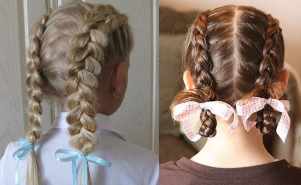 Прическу с двумя косами на 1 сентября для девочек 1-го класса можно сделать на длинные волосы. Если у девочки волосы чуть ниже плеч, то вы сможете быстро сделать такую прическу своими руками, причем в течение получаса.