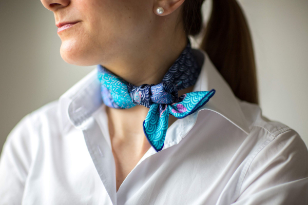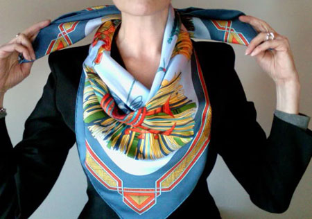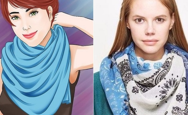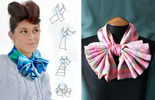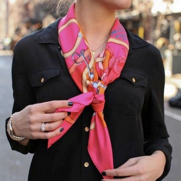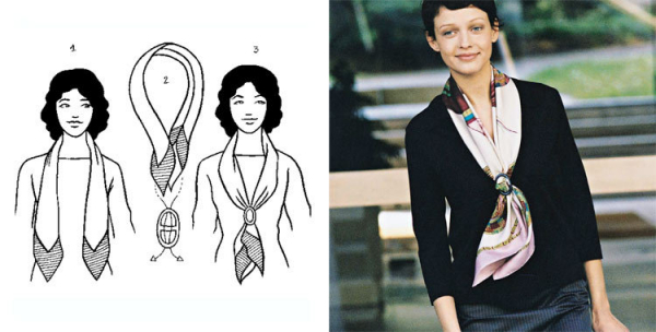 Если вы выбрали платок большего размера, то его кончики будут свисать вниз, если меньшего, то они будут кокетливо смотреть в разные стороны. Такой способ повязывания подойдет под куртку, платье и любую другую одежду с V-образным и овальным вырезом.