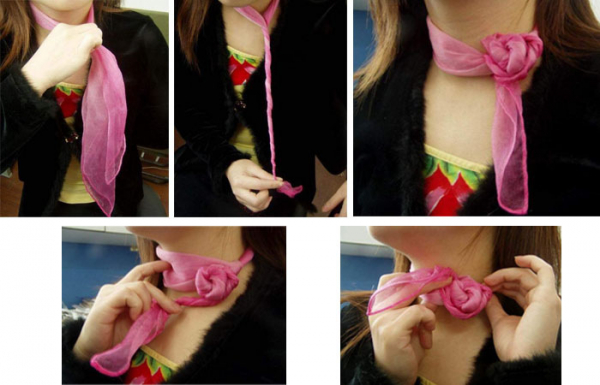 Кстати, цветок необязательно должен быть таким объемным. Если вы хотите сделать лишь небольшой акцент на своей женственности, выберите платок маленького размера и повяжите его плотно вокруг шеи. Главное, чтобы ткань была тонкой. Также для этого случая отлично подойдет шарф.