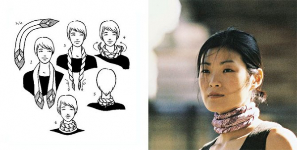 Особенно такой метод повязывания платка окажется хорош для девушек с тонкой шеей, для обладательниц коротких и гладких стрижек, а также для образа с открытыми плечами.