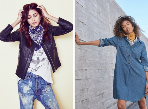 В последнее время модницы очень полюбили завязывать платок на шею в самом что ни на есть настоящем ковбойском стиле. Причем в этом виде украшение одинаково хорошо смотрится с комбинезонами, куртками, рубашками, футболками и жилетками.